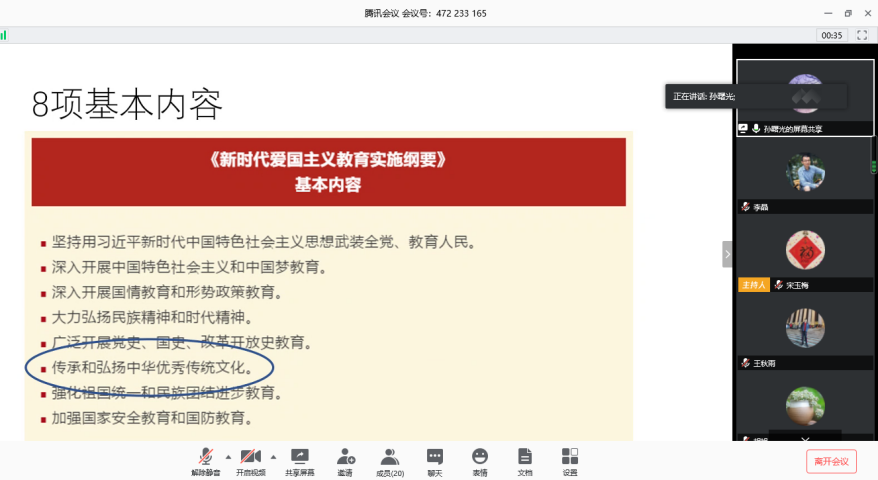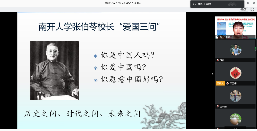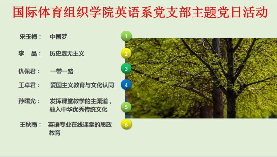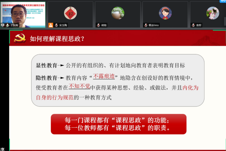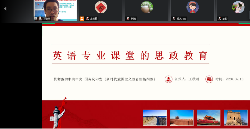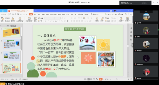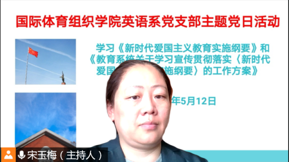 为进一步推动《新时代爱国主义教育实施纲要》学习宣传,深刻理解新时代爱国主义的内涵与要求,国际体育组织学院英语系党支部于2020年5月12日开展了主题党日活动。活动由支部组织委员宋玉梅同志主持,全体教师党员出席了本次云端主题党日活动。