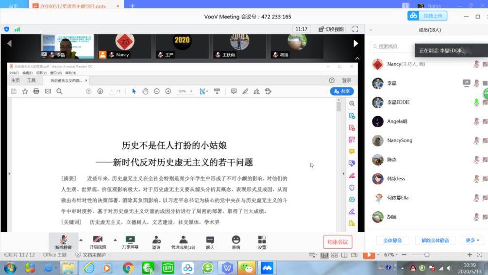 李晶同志导学的主题是历史虚无主义的危害及应对策略。《实施纲要》要求,广泛开展党史、国史、改革开放史教育。历史是最好的教科书,也是最好的清醒剂。历史也是思想政治教育最好的素材,但是用什么样的历史教育学生,怎样用历史教育学生,是每个教育工作者应该深入思考的问题。导学从历史虚无主义是什么,有何表现,到历史虚无主义产生的原因,最后提出策略,对深入认识历史虚无主义提供了理论支持。