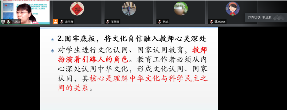 孙曙光同志结合自己对教学的认真思考,针对“发挥课堂教学的主渠道,融入中华优秀传统文化”主题进行了精彩阐释。主要内容包括:介绍2个板块(基本内容+主要抓手);聚焦2个重点(发挥课堂教学的主渠道,融入中华文化);分析2个案例(他山之石—大连理工+结合实际)。她同时还为大家准备了测试题目,大家的反馈充分证明她的讲解取得了良好教学效果。