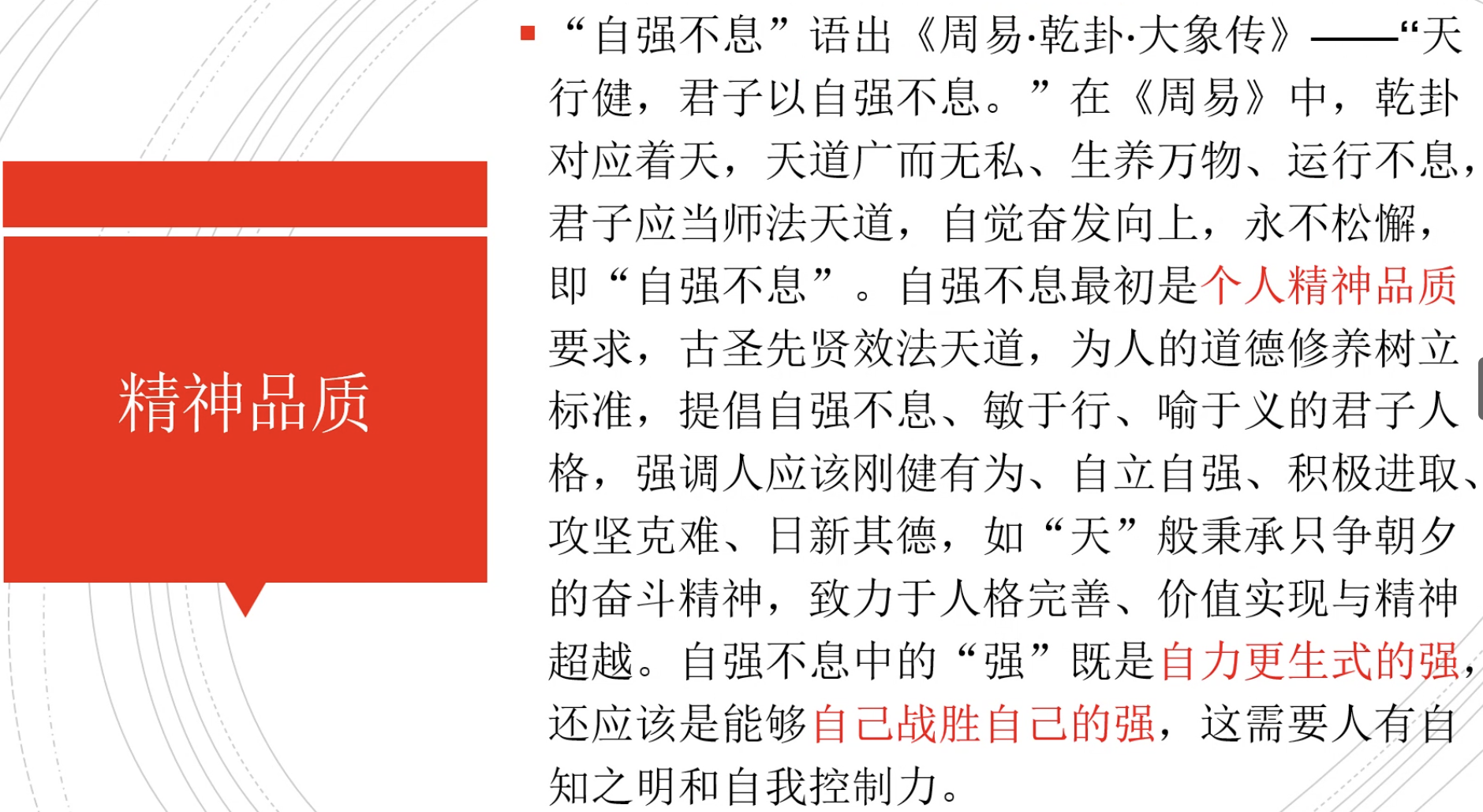 接着,韩亚辉老师带领大家回顾了二十大报告中的传统文化理念,呼吁大家要响应习总书记的号召,全面认识历史进程、系统把握历史规律、深刻汲取历史智慧,不断坚定历史自信,增强历史主动,从中华优秀传统文化中汲取智慧和力量。韩老师以“自强不息”为主题,从其内涵出发,诠释了“自强不息”蕴含的精神品质和民族气节。自强不息精神源于中华民族对家国情怀的责任和担当,不仅体现为建国以来党和人民坚持独立自主、自力更生的建设道路、更体现为中国特色社会主义新时代背景下党和人民创新开拓的信念和奋斗。