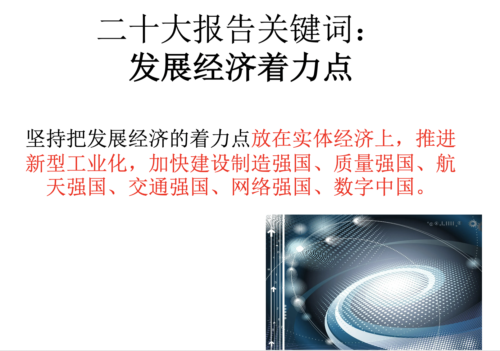 最后,陈杰老师以“发展经济着力点”为题,带领大家认识到实体经济是我国发展的本钱,是构筑未来发展战略优势的重要支撑。陈老师侧重回顾了党的十八大以来对我国实体经济发展理念、发展格局的重大部署,并通过具体数据说明十年来我国实体经济不仅在量的方面实现稳步增长,也在质的方面取得显著提升,经济规模更大、实力更强,实现了结构优化和质量提升,增强了支部教师的制度自信。陈杰老师结合习总书记在11月初中国国际进口博览会的讲话及当下疫情,提出各行各业要在党的领导下,以开放纾发展之困、以开放汇合作之力、以开放聚创新之势、以开放谋共享之福,推动经济全球化不断向前,外语专业的师生要有国际视野和国际情怀,推动中国实体经济发展成果更多更好地惠及全球。
