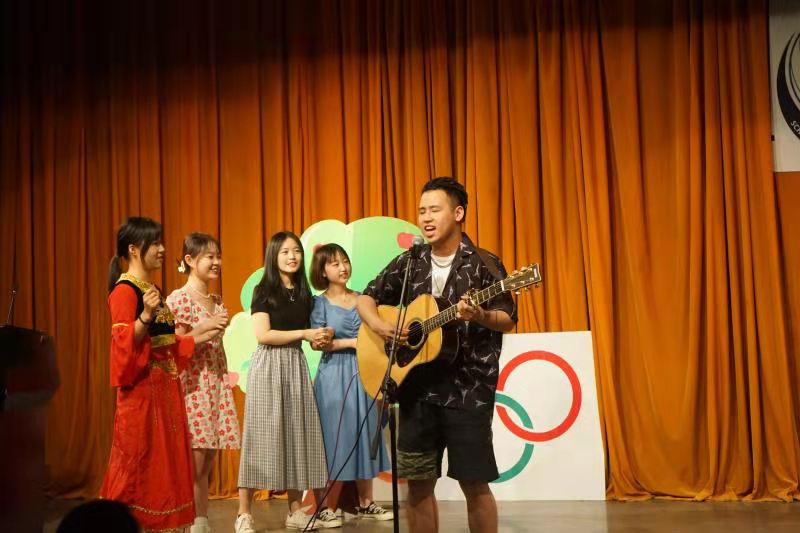 彩虹如斯,哈萨克斯坦的篝火点燃在场景三的中央。场景三的开场由葡萄牙语班胡启钧同学演唱了一首英文歌曲《Imagine》。胡启钧同学干净、真挚的歌声带着我们进入了一个和平与美好共存的世界,使人仿佛置身于世外桃源,不必忧虑其他,安稳的度过一个宁静的夜。
