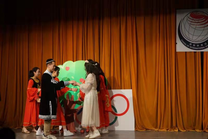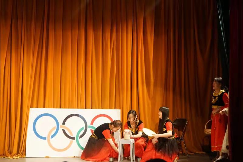 舞毕,捷克语班杨光润同学扮演的哈萨克斯坦英俊小伙将陈思羽同学带入了村落,朴实热情的村民们摘苹果、烤奶茶,魔术、打雪仗,无一不将自己的光热散发出来,温暖这个女孩儿。