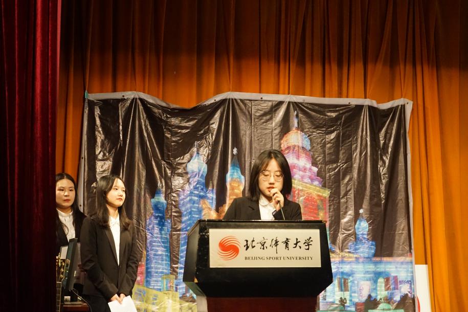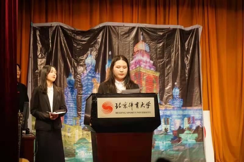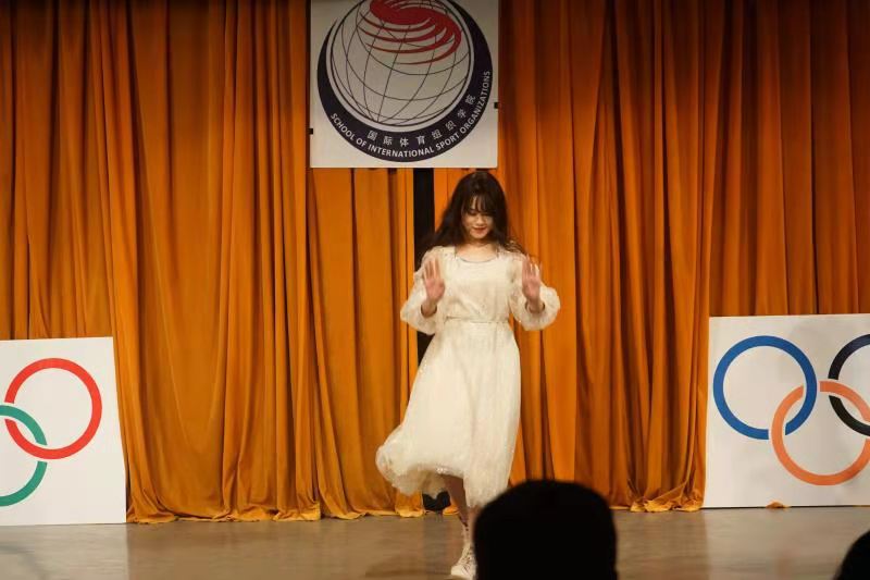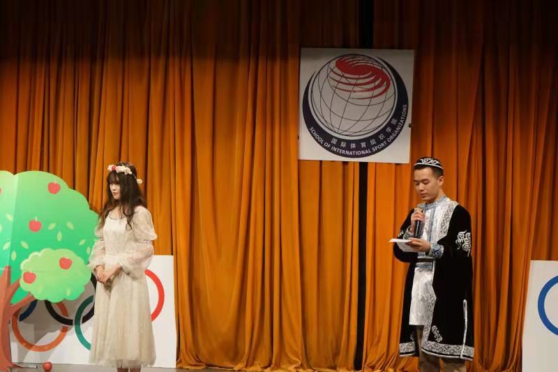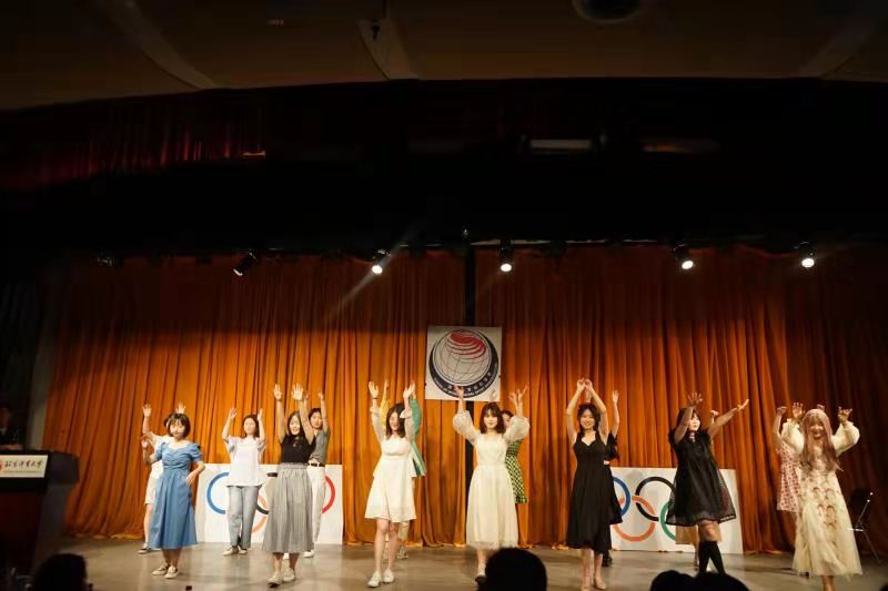 随后来到表演部分,舞台表演部分。舞台剧的总体设计以现代与传统融合为主题,由葡萄牙语班陈思羽同学扮演的阿拉木图舞团主舞的角色串联起整个舞蹈。表演部分共分为三个场景。大幕徐徐拉开,犹见一群活力女孩欢歌笑语而来,似乎将场景带到了阿拉木图现代舞团的表演现场。在欢快的哈萨克斯坦《Latte》的音乐声中,阿拉木图舞团的舞蹈演员们活力起舞,热情洋溢,体现出哈萨克斯坦人民的动感与激情,点燃了整个舞台。