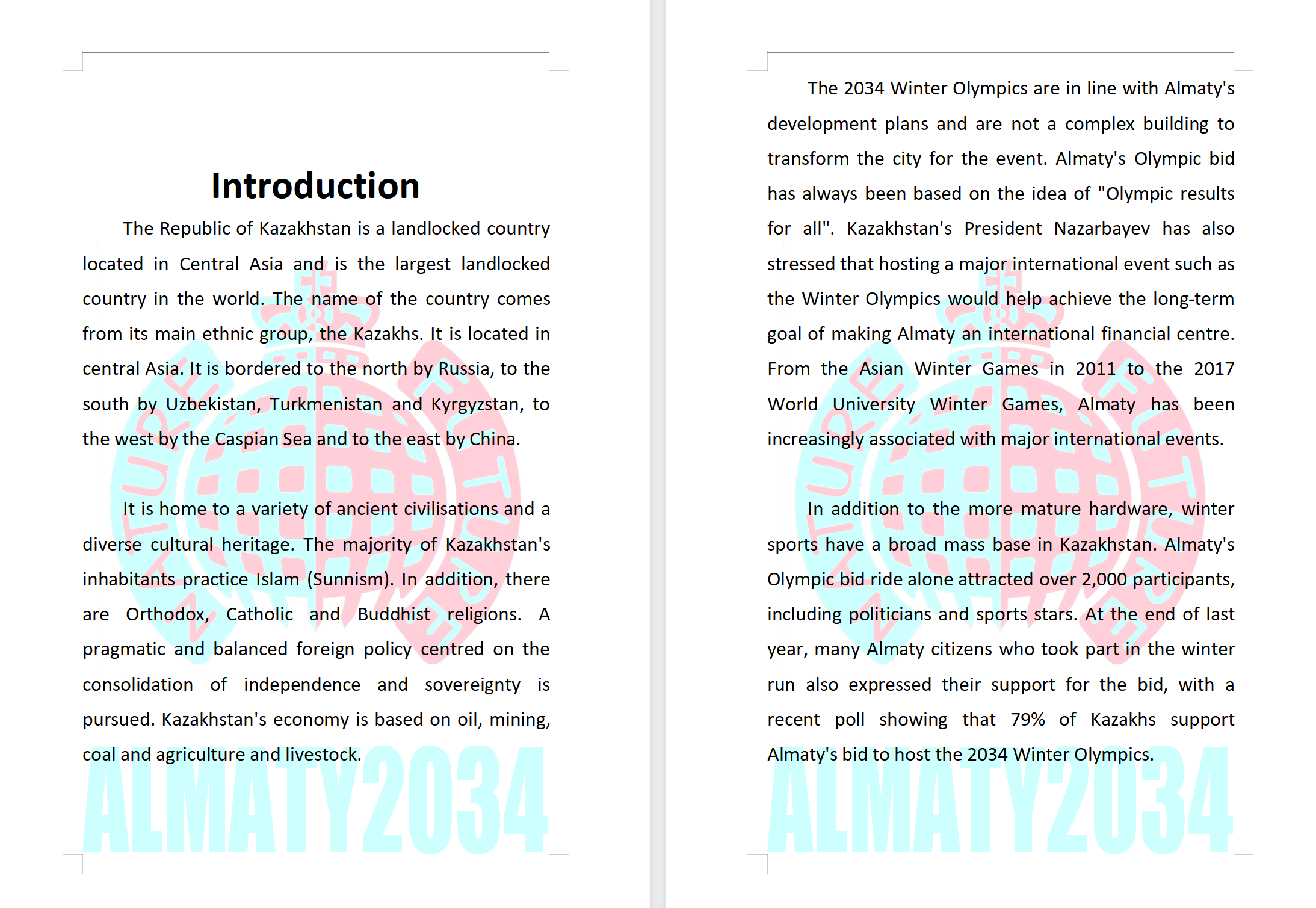 首先,在申办答卷和申办意愿书中,我们展示了阿拉木图申办2034冬奥会的独特优势和模式。2034年冬奥会符合阿拉木图的发展计划,并不是为了赛事而改造城市的复杂建筑。阿拉木图的申奥一直是基于 "人人享有奥运成果 "的理念。哈萨克斯坦总统纳扎尔巴耶夫也强调,举办像冬奥会这样的大型国际活动将有助于实现使阿拉木图成为国际金融中心的长期目标。从2011年的亚洲冬季运动会到2017年的世界大学生冬季运动会,阿拉木图已经越来越多地与重大国际活动联系在一起。