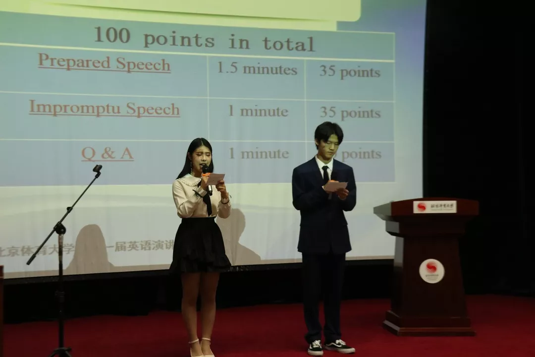 晚上七点整,演讲大赛准时开始。宋洛紫、郑逸淮同学担任主持,他们来自本次比赛的承办学院——国际体育组织学院。
