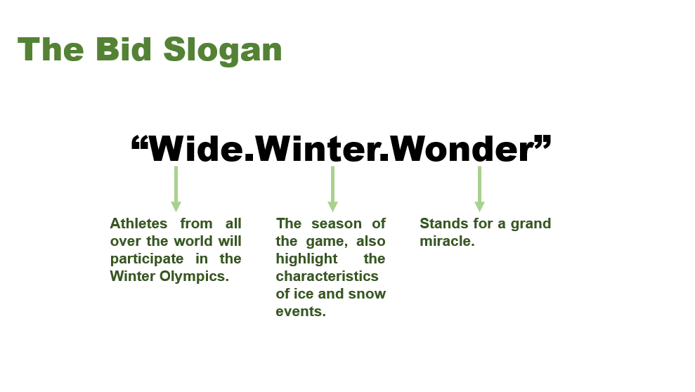 我们的标语是”Wide. Winter. Wonder”,这一标语来自于我们对奥林匹克精神的理解,”wide”不仅代表世界各国以平等的姿态广泛参与冬奥盛事,也指冬奥会会获得社会各界的广泛关注,取得圆满成功,寄予了我们的美好愿景。”Winter”冬季是因斯布鲁克的最美季节,冰天雪地,银装素裹,让人仿佛置身于阿尔卑斯山巅拥抱冬日;“Wonder”的奇迹是我们对2034年冬奥会期待与信心,有过两次申办经验的因斯布鲁克一定能在2034年的国际舞台上再创奇迹。