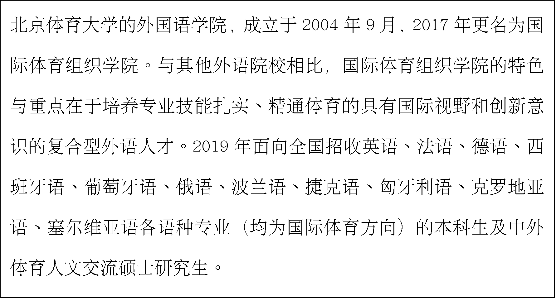 其次,相比其他语言专业院校,北体的外语类专业有更加鲜明独特的体育方向,这将在很大程度上提高我们的竞争力。因而,选择了北体国际体育组织学院。