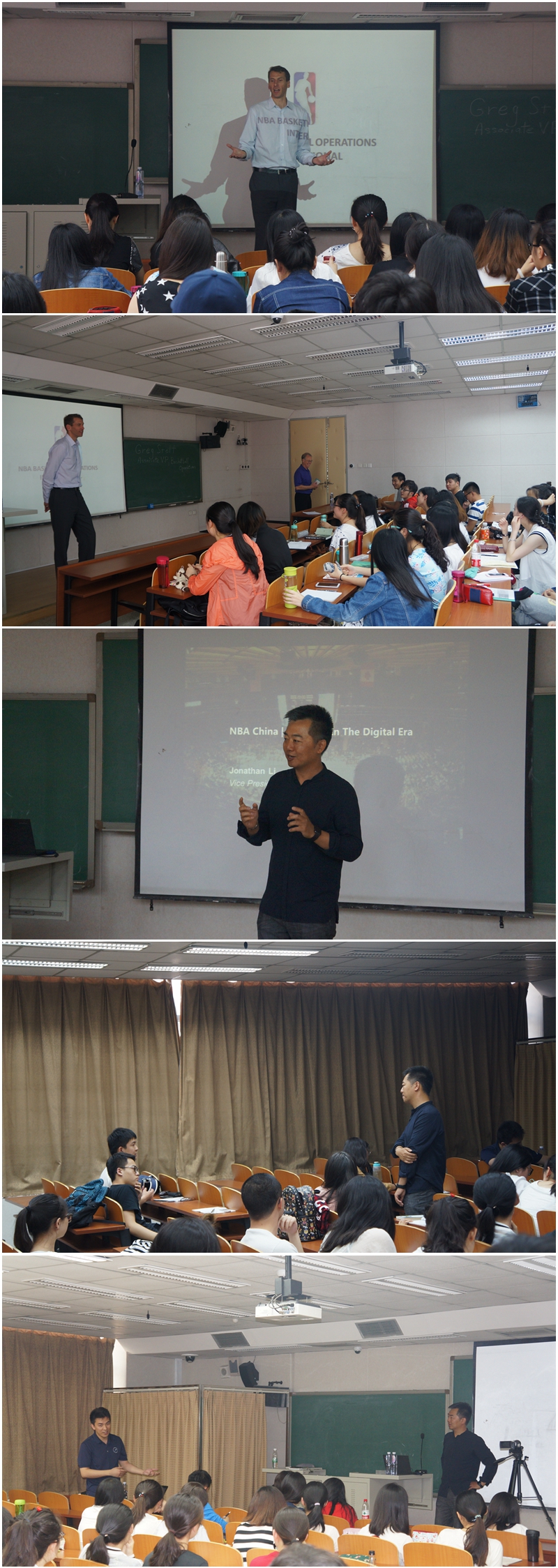 北京时间2016年5月19日星期四下午14:00-18:00,在教学楼310,外语系举办了两场关于体育经济管理的讲座。NBA中国的两位高管Gregory Stolt 和Jonathan Li 受邀与同学们面对面,讲述了NBA运营与管理方面的内容,并为在场的师生答疑解惑。参加讲座的有外语系短期外专Dr. James Thoma, Dr. Brett Nichols, 课程负责人武婷老师,还有教研室部分教师以及各院系感兴趣的同学们。