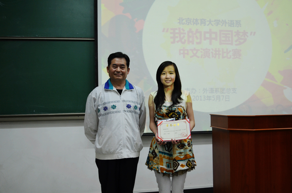 为响应学习习近平总书记在五四青年节讲话的号召,鼓励同学们放飞梦想,立志成才,报效祖国。2013年5月7日,外语系团总支专门举办了“我的中国梦”主题演讲比赛。系党总支书记赵京慧老师,校纪委童蕴芝老师,系团总支书记刘彬老师出席此次比赛,并担任评委。10、11级辅导员刁艾莉老师也特地前来为同学们加油助威。