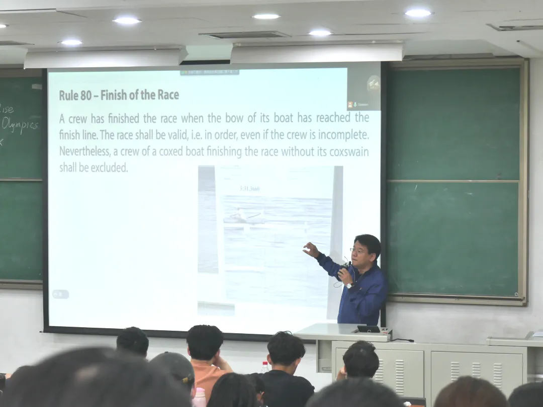 首先,梁冰老师向同学们介绍了学习和考取裁判证的个人经历。他提到,为成为一名赛艇裁判员,他面对的第一项工作就是重新矫正规则,解读规则手册。因此,梁冰老师在PPT中展示了部分规则英语原文,和同学们进行了一次简短的规则解读互动。