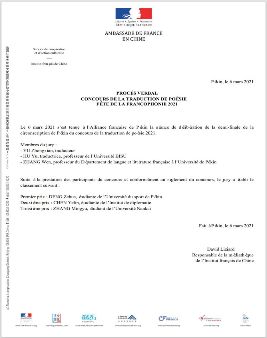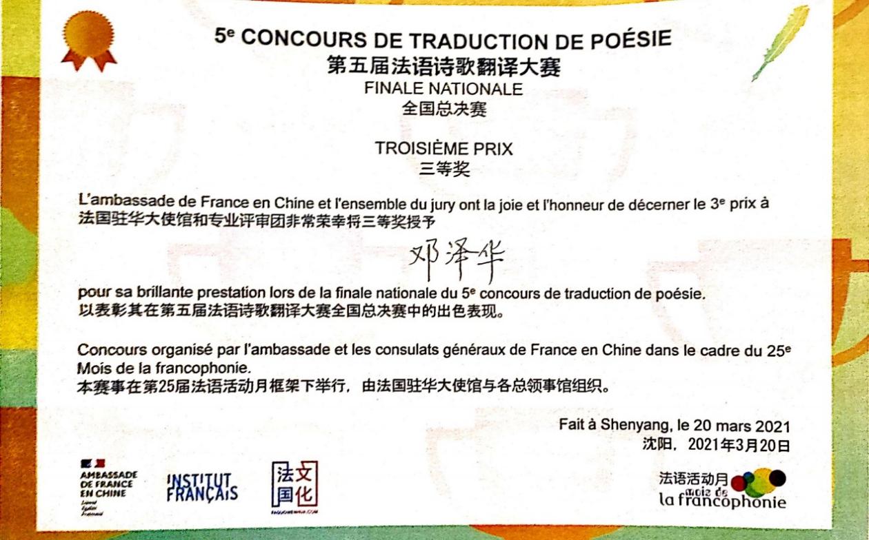 每年三月,法国驻华大使馆联合多个驻华使团与外交机构举办“法语活动月”系列文化活动,今年已是第25届。“法语诗歌翻译大赛”是其中最受瞩目的活动之一,吸引全国众多法语学生参加。本次大赛分为初赛、地区半决赛和全国总决赛三个阶段。参赛选手需将三首现代法文诗作翻译成中文,各领事区从中评选出至少六名参加半决赛。半决赛选手需用法语介绍对诗作的理解及整体翻译的理由,并回答专业评委的提问。邓泽华同学在初赛中脱颖而出,晋级北京赛区前六强;随后在半决赛中以精彩的表现获得现场评委高度赞扬,夺得北京赛区冠军。全国总决赛于3月20日在沈阳举行。决赛选手现场抽取法文诗作笔译成中文,之后面向全国评委团用法语介绍译作并回答提问。邓泽华同学最终凭借扎实的语言功底和出色的现场发挥摘获三等奖。