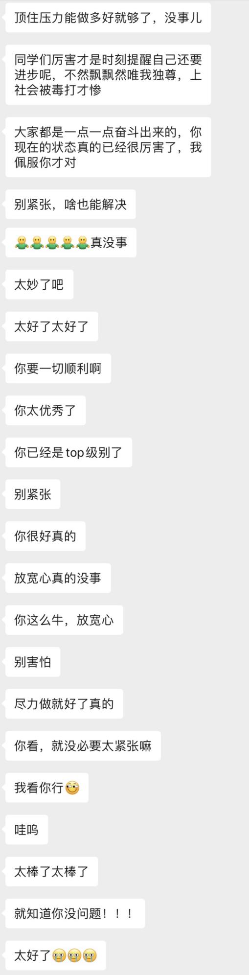 这里还要特别感谢我们学院的纪学姐,从我开始决定留校读研开始就给予我莫大帮助,无论是学习还是生活方面,只要我有问题,学姐都毫无保留进行解答。在我怀疑自己的时候,也一直鼓励我、支持我。截图中是学姐一些暖心的话语,希望大家也能受到鼓舞!
