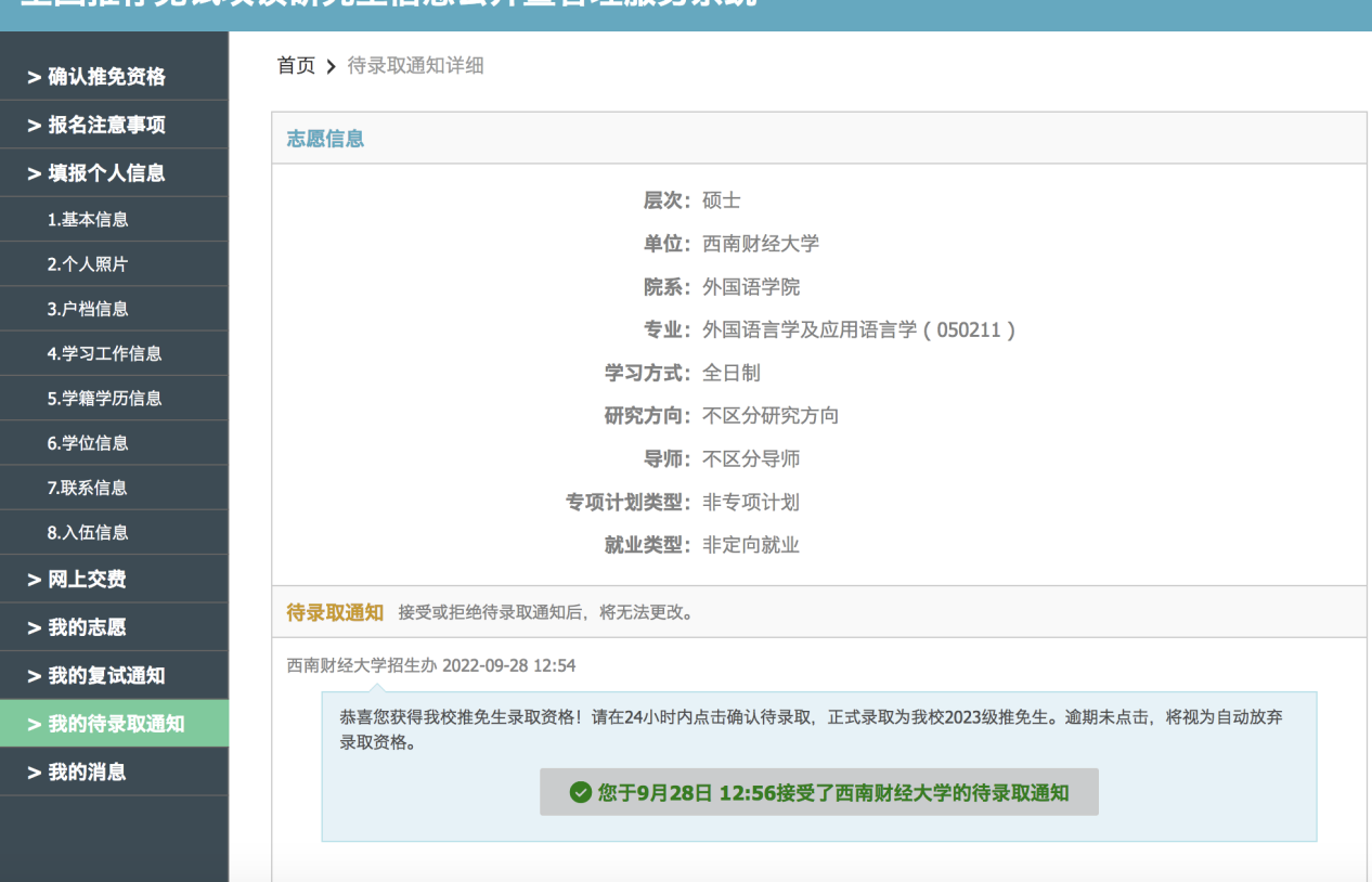 9月28日中午12点56分,我用颤抖的手点下了“接受”键,正式与号称“984.5”的西财双向奔赴了。至此,我紧张刺激的推免之旅终于告一段落。