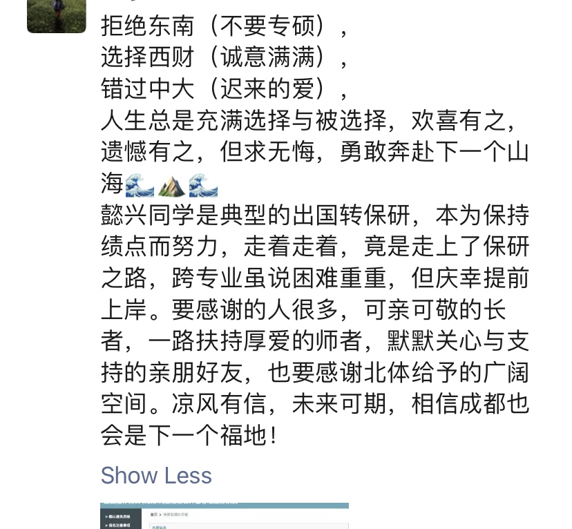 推免是一场信息战、心理战和时间战。各大院校的研招网、学院网还有一些社交平台都是获取信息的渠道,及时收集信息才能有效避免错过获得梦校入场券的机会。在推免路途上,你可能会因为害怕初审被拒、复试发挥不好而焦虑、失眠,但请一定稳住心态,不到最后不放弃。我记得在我接受西财拟录取通知三小时后,我的梦校之一中山大学打来了电话,但我已无法再作出改变,只能忍痛告别。之后,我一遍又一遍地刷着拟录取名单,想着那上面本该有我的名字,这是我推免路上最遗憾、最“意难平”的一件事。不过,在老师和家人的开导下,我很快调整好了心态,毕竟西财也是我的心仪学校之一,我也选到了心仪的专业,找到了心仪导师,不如我就把这遗憾化为继续努力前进的动力。