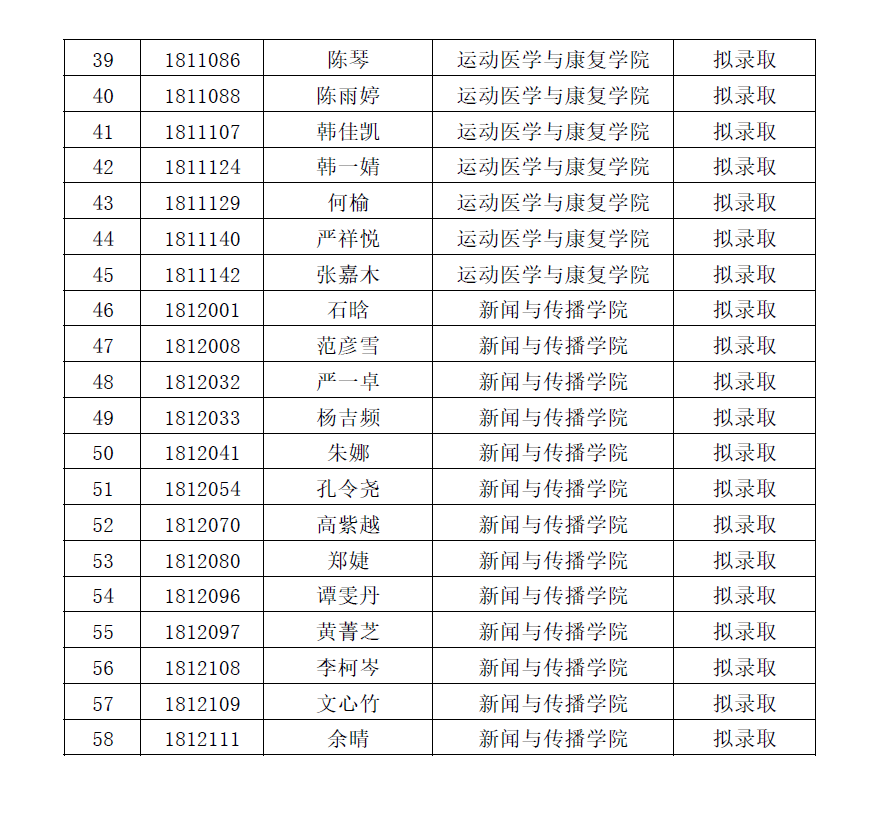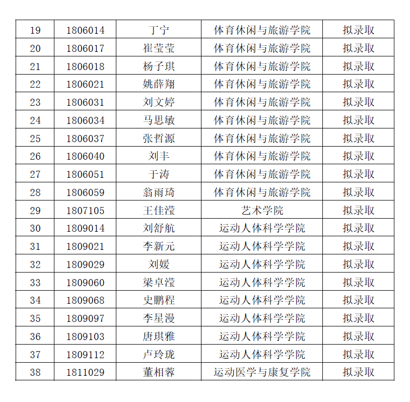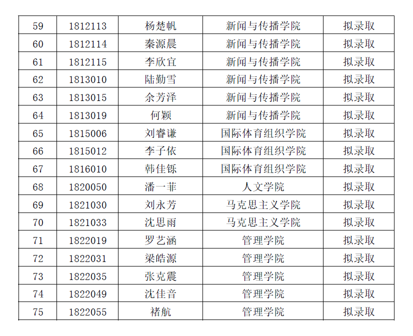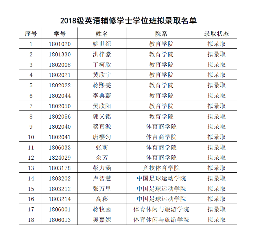 经国际体育组织学院招生考试选拔,2018级英语辅修学士学位班拟录取75人,后续发布缴费、分班等信息。拟录名单如下: