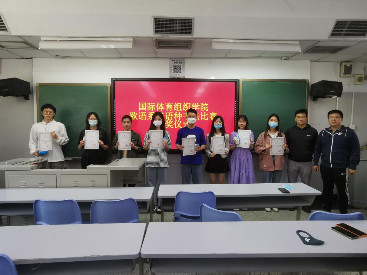 5月28日中午12:10分,2021年欧语系多语种书法大赛颁奖仪式在教学楼101教室举行。国际体育组织学院党总支副书记尹小光老师、学院副院长郑辉老师、欧语系系主任陈燕老师以及学生辅导员曹笑凡老师参加颁奖仪式并为获奖学生代表颁发获奖证书与奖品。颁奖仪式由欧语系副系主任谢阶明老师主持。