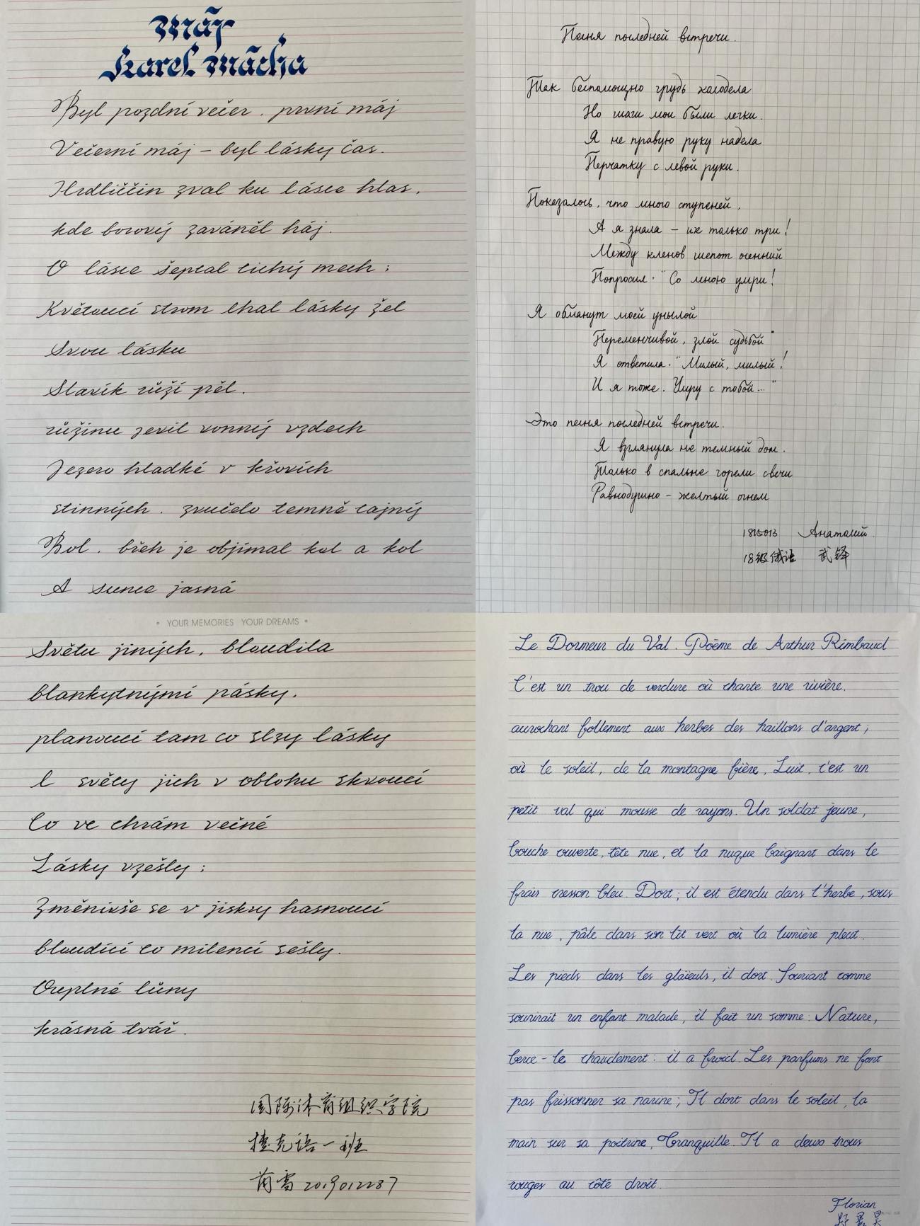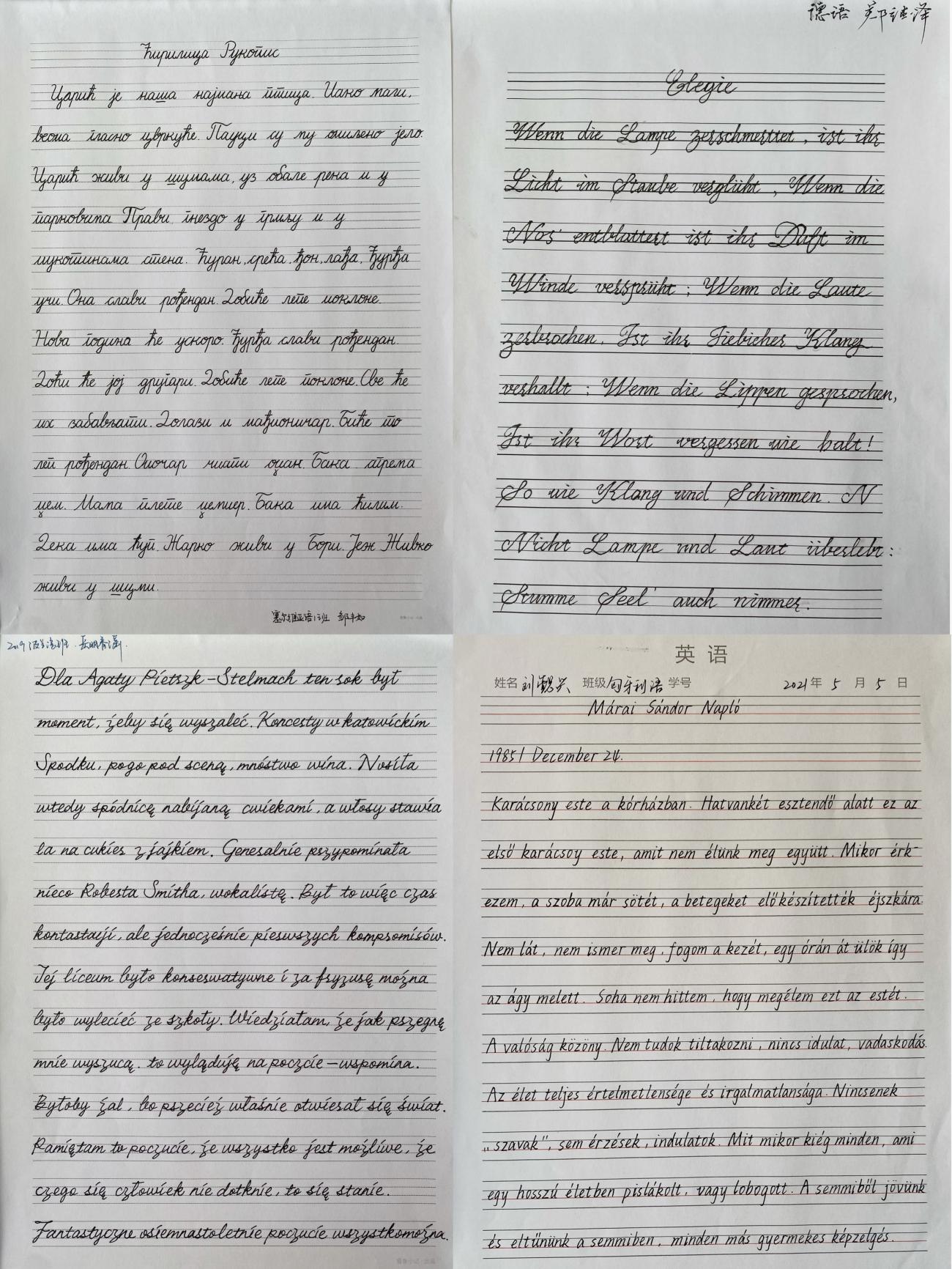国际体育组织学院欧语系为进一步激发各语种专业学生对所学语言的热爱,促进学生的学习积极性与主动性,展现学生风采,特举办“国际体育组织学院欧语系多语种书法大赛”。本次大赛得到欧语系学生的积极响应,全系3个年级10个语种皆参与其中,共收到参赛作品200余件。评委小组在认真比较讨论之后最终评审出40名获奖学生(名单附后),其中芮雪、胡妙珂、刘懿兴、岳明春潇、邹丰如、郑晨昊、梁誉馨、武铎、彭梦圆、郑继泽等10名同学荣获特等奖。