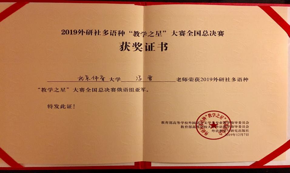 2019年12月6日—8日,由教育部高等学校外国语言文学类专业教学指导委员会、教育部高等学校大学外语教学指导委员会和外语教学与研究出版社共同举办的2019外研社多语种“教学之星”大赛全国总决赛在北京圆满落下帷幕。国际体育组织学院欧语系俄语专业教师冯雪首次参赛便获得总决赛晋级资格,总决赛中发挥出色,获得各位评委的一致认可和赞誉最终斩获总决赛俄语组亚军荣誉。
