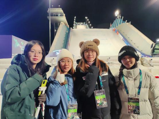即时引语是我们四位同学之前从未接触的领域,在这次工作中,我们首先要深入了解运动员的各种情况,列出具有针对性的问题。其次,在采访过程中,我们要照顾运动员的情绪,与他们保持友好沟通,采访问题也要根据现场情况随机应变。最后,得到采访素材后,要第一时间回到工作间将录音形成中英双稿,并在一小时内上交。这一开始对我们来说是极大的挑战,时间紧迫,我们几乎每天都在大跳台和工作间的线路上来回奔波,在寒风中观察比赛情况,不愿意错过任何一个采访机会。慢慢地,我们适应了工作节奏,无论是对场地、对工作内容、还是对各位运动员,我们都完成了“从陌生到熟悉”的转换。