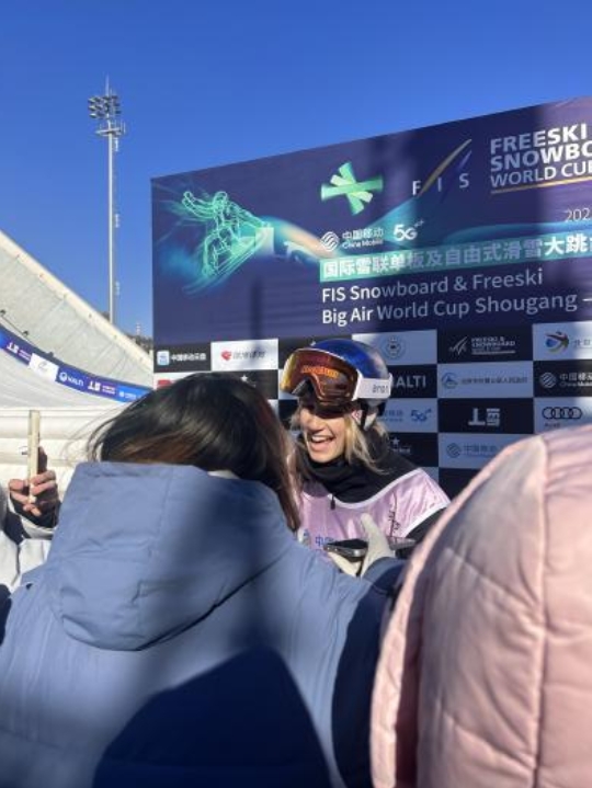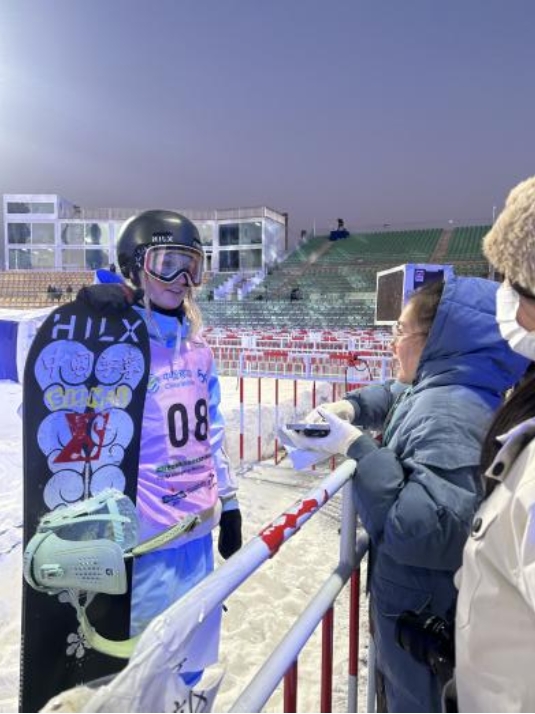 通过采访,我对奥地利女子单板运动员安娜·加塞尔印象颇深。她18岁从体操项目转项至单板滑雪,在2018年拿下冬奥会历史上首枚单板滑雪大跳台项目金牌,如今已是一名32岁的老将。今年她同样获得了该赛事的冠军,这是自北京冬奥会后,她再一次在首钢赢得金牌。从训练日到决赛,我们分别对安娜进行了三次采访,她温柔谦逊,每一次都给予我们热情回应。我也在和她的交流中,更加深入地了解她背后的故事。我为她向往自由、挑战自我的勇气所吸引,被她坚持不懈、永不言败的精神所折服,为她乐于接纳、善良谦逊的态度所感动。