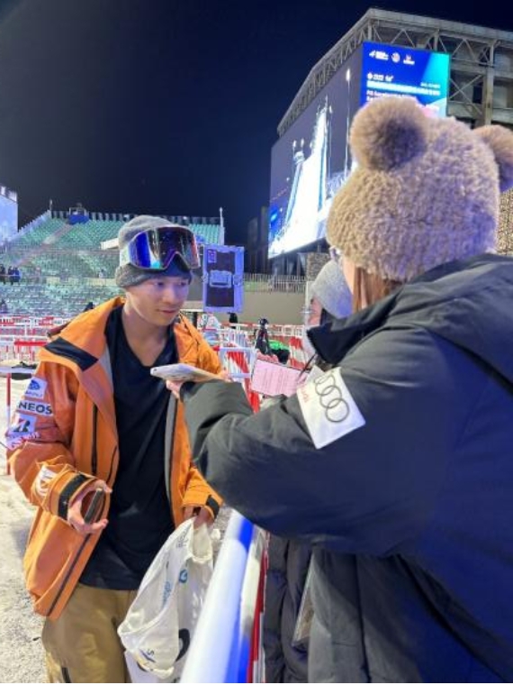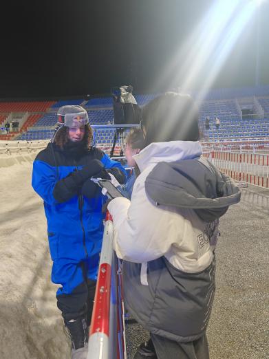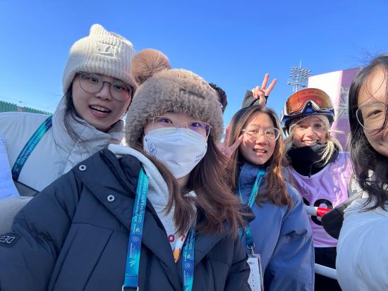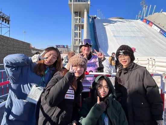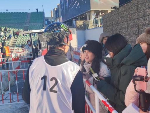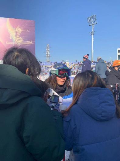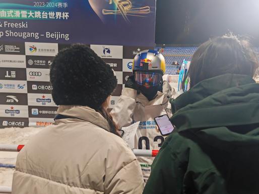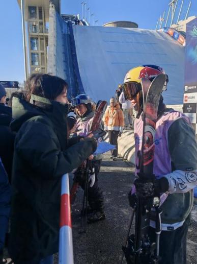 与此同时,这次的工作经验也给予了我们一个机会,由观众化身为记者,从屏幕前走到混采区,以另一个视角参与到体育赛事中来,记录下冰雪中的热情。近距离地与运动员们接触、对话,比起记者与受访者,我们更像是逐渐熟悉的朋友,共享着喜悦和遗憾。他们对我们来说不再只是名单上的一串字符或是屏幕上的二维形象,我们可以在混采区记录着他们完成创新动作的激动,倾听着他们来到大跳台、来到中国的新体验,共享赛事乐趣,这些都是转播镜头难以叙述的故事。而在现场见证选手们的一次次尝试、创新,也让我们极大地感受到了竞技体育的魅力。在采访美国自由式滑雪运动员亚历山大·霍尔时他曾谈到,进行动作上的创新、挑战更高难度的技巧,不单只是为了取得一个好成绩,更多地是在挑战自我,挑战人类的运动极限。比赛场上与其说选手们是相互竞争的对手,倒不如说是朝着同一个目标努力的伙伴,他们都在不断地挑战自我,用行动向我们展现人类征服冰雪与天空的勇气,展现携手同行的团结精神,我想,这正是滑雪这项运动的魅力所在,也是我们新闻工作者想要向观众们传达的精神所在。