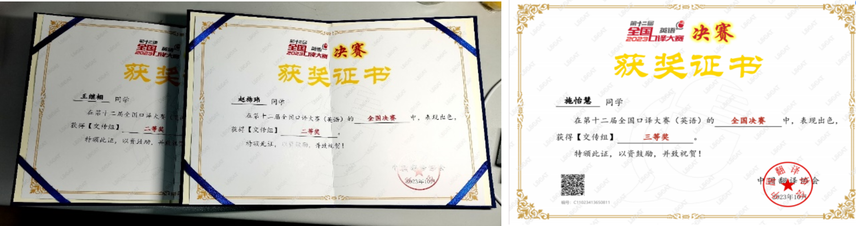 2023年12月9日和10日,第十二届全国口译大赛(英语)总决赛在北京语言大学举行,国体2020级英语口译实验班赵旆玮及王继栩同学获得交传组全国二等奖,施怡慧同学获得交传组全国三等奖,这是我校参加该赛事以来取得的最佳成绩。