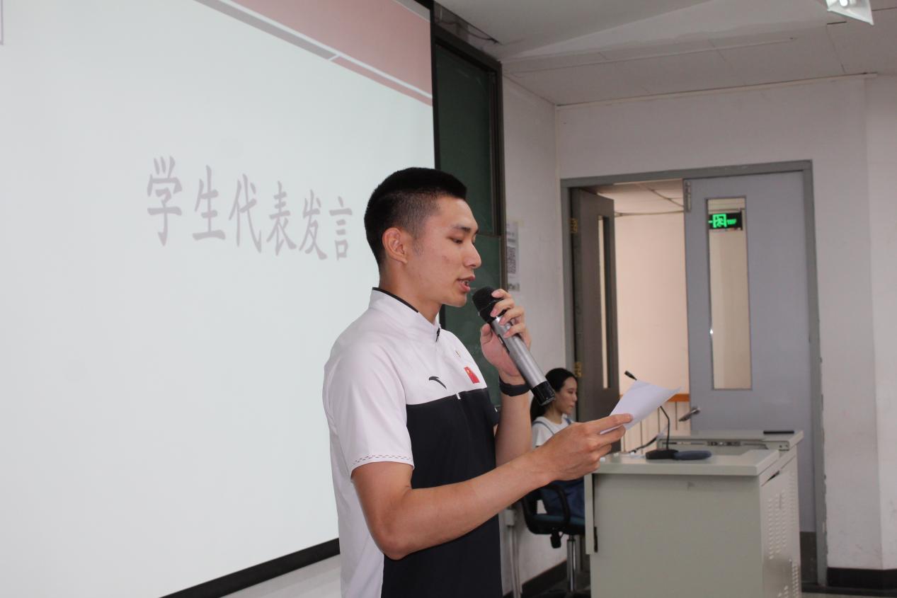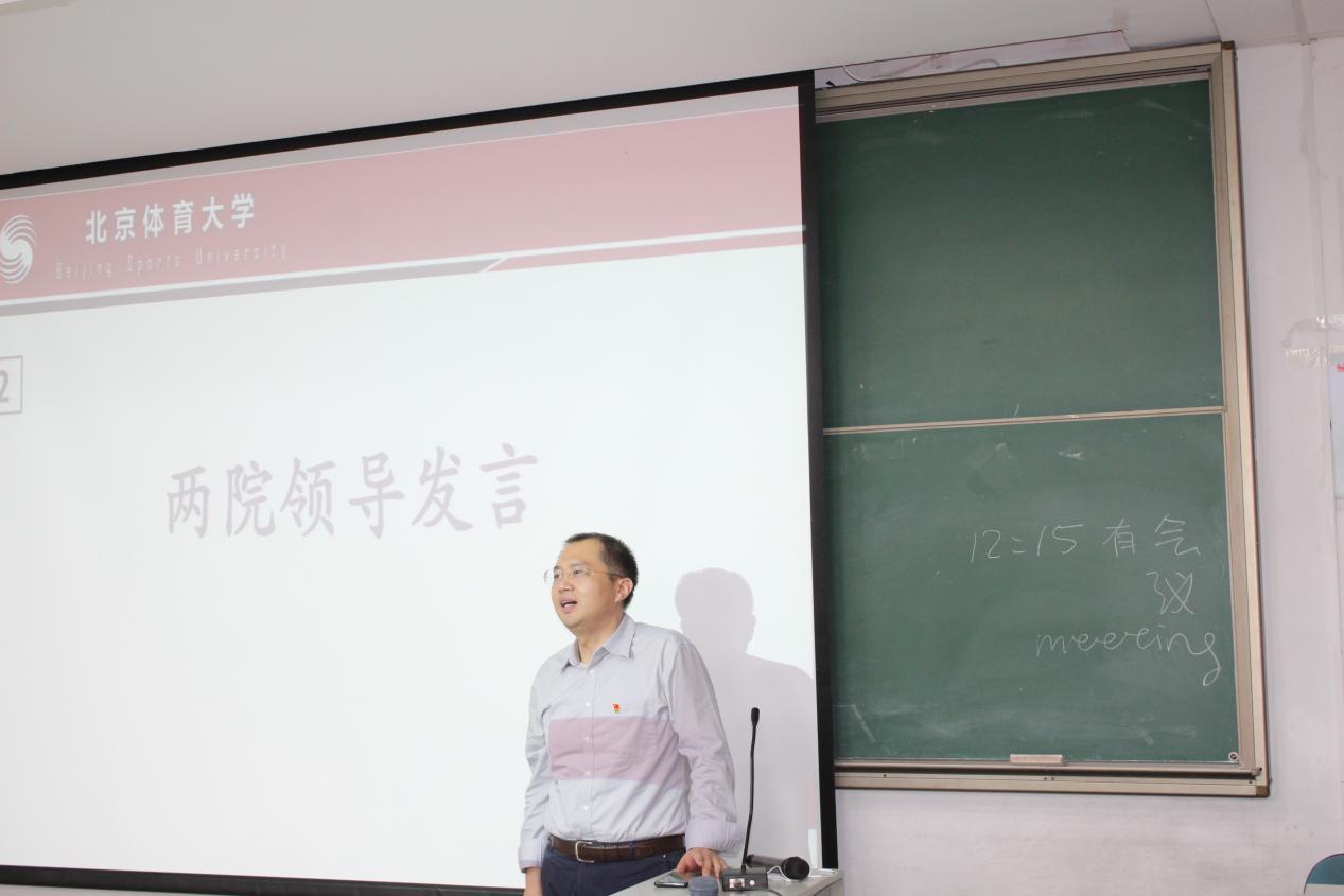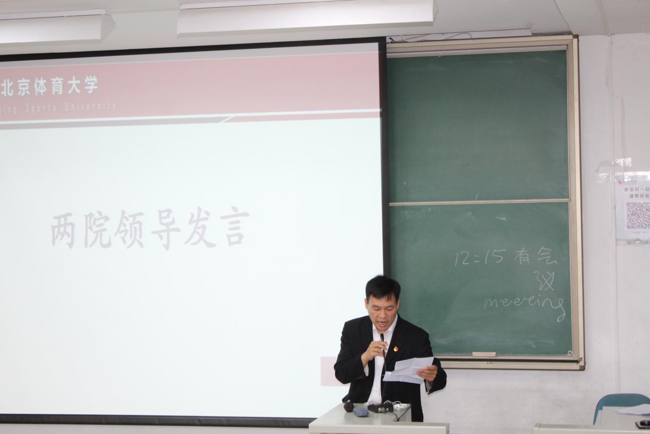 会议第二项议程是学院领导讲话。首先进行讲话的是国际体育组织学院党总支副书记尹小光老师,他在讲话中提及,希望两院学生充分发挥各自的专业优势,进一步推进学术教育与强身健体、全民健身相结合、相促进,即提升竞体同学的英语水平,也不断激发国体学生的体育兴趣和掌握体育专业知识的意愿。