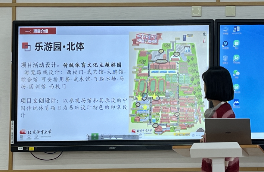 第三组体育文创展示的主题是《乐游园·北体》,成员为刘楚枫、汪玫汝、张瑀桐、王子辰、程杨,该项目旨在为外国来宾深度体验BETWAY·中国校园和中华传统体育运动而特别设计,在学校重要场馆设置了不同传统体育项目体验活动,发挥国体语言优势,为外宾提供多语种专业讲解。该组文创产品是根据校园重要场馆设计的印章图标,在完成一个场馆的游览后将在专用的集章册上盖上对应的图章。将校园特色和传统体育文化相结合,为BETWAY·中国国际交流、外宾接待设计了新方式,也为传播中华传统优秀文化和体育精神提供了新思路。