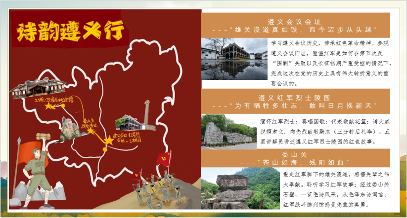 第四组《征寻红迹体育之旅》项目的设计成员为余若芸、路梓艺、郑彤、魏嘉怡。该项目在体旅融合背景下,整合体育旅游与红色旅游要素,打造精品红色体育旅游路线,推动遵义旅游产业的发展,打响红色体育旅游品牌。项目组对遵义红色资源和体育旅游潜力进行了市场分析,设计了“诗韵遵义行”旅游路线和“三位一体”系列赛事,包括“重走长征路”马拉松大赛、山地定向越野、山地自行车越野赛,对于相关产品IP和名人宣传进行了设计,对于红色精神和体育精神进行了有机结合,是助力中国红色旅游和体育旅游融合发展的一次尝试。