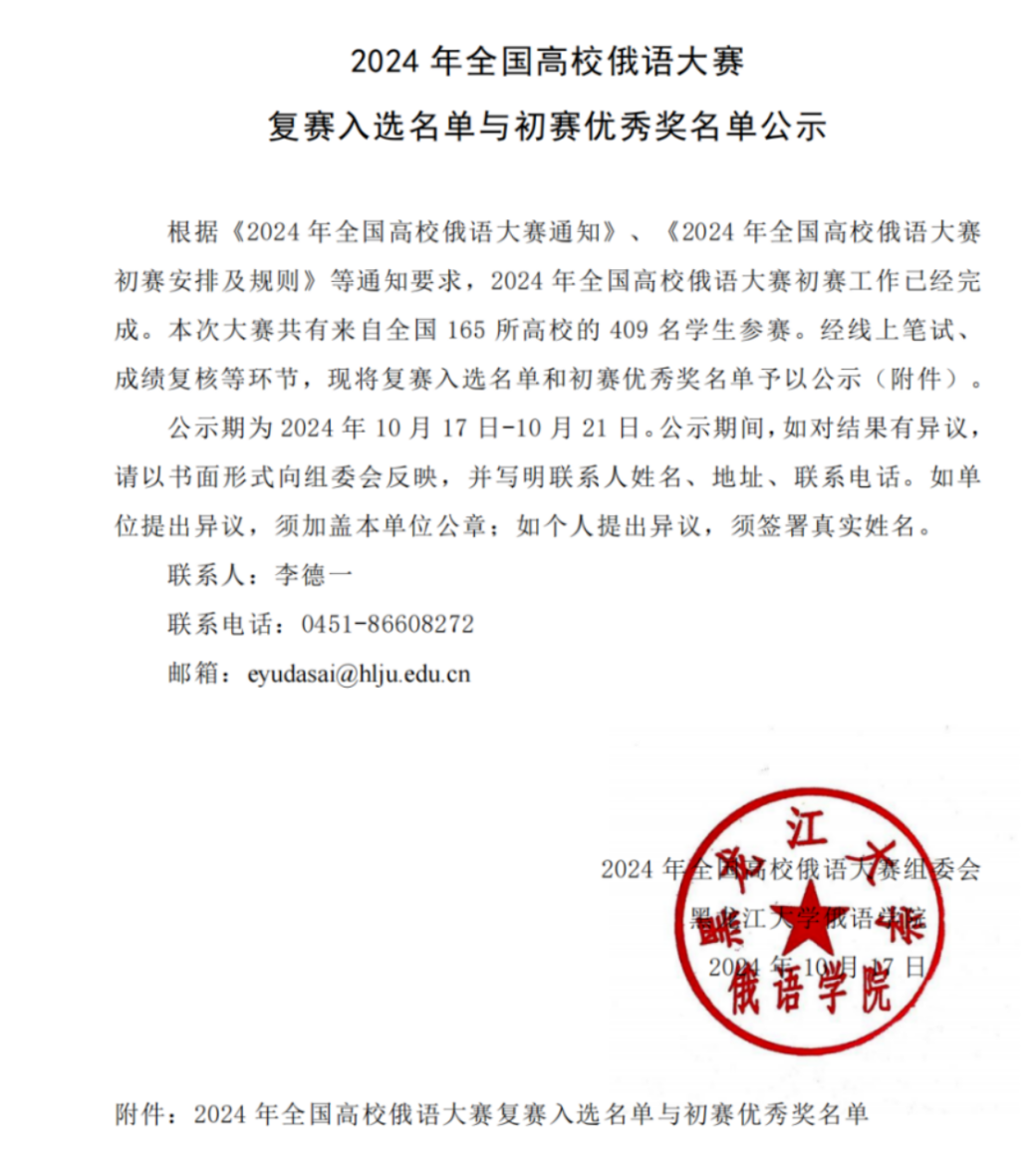 20241015日,由教育部国际合作与交流司主办、黑龙江大学承办的2024年全国高校俄语大赛如期举行。我院2023级俄语专业学生咸然加低年级组比赛,经过激烈角逐,最终从来自全国165高校409名选手中脱颖而出,排在低年级组第52,获得了初赛优秀奖。这是我院俄语专业学生参加此项赛事再次获得该奖项,是对我院俄语专业学生培养成果的再次认可和鼓励